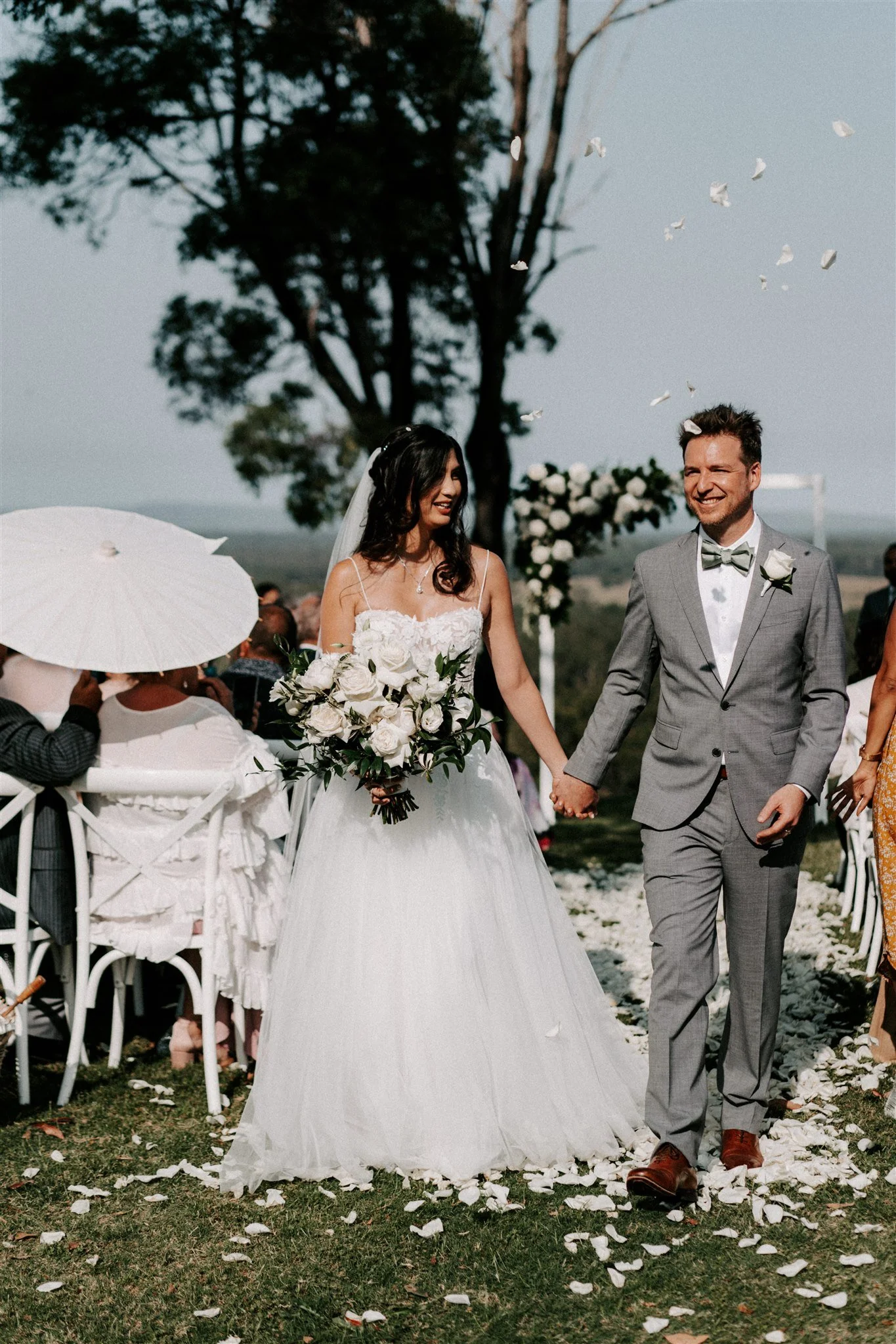 Venue: Maravista Farm; Planning and Styling: Lovebird Weddings; Florals: Mondo Floral Designs; Photographer: Luke Middlemiss; Marquee: Sperry Tents Sunshine Coast; Catering: Spoonfed Catering; Makeup: Tasleema Nigh; Hair: Renee Saville; Ceremony & Garden Party Music: Cello Dreaming; Reception Music: Rush Entertainment; Transport: Boomerang Bus Hire; Bathrooms: Portable Powder Rooms