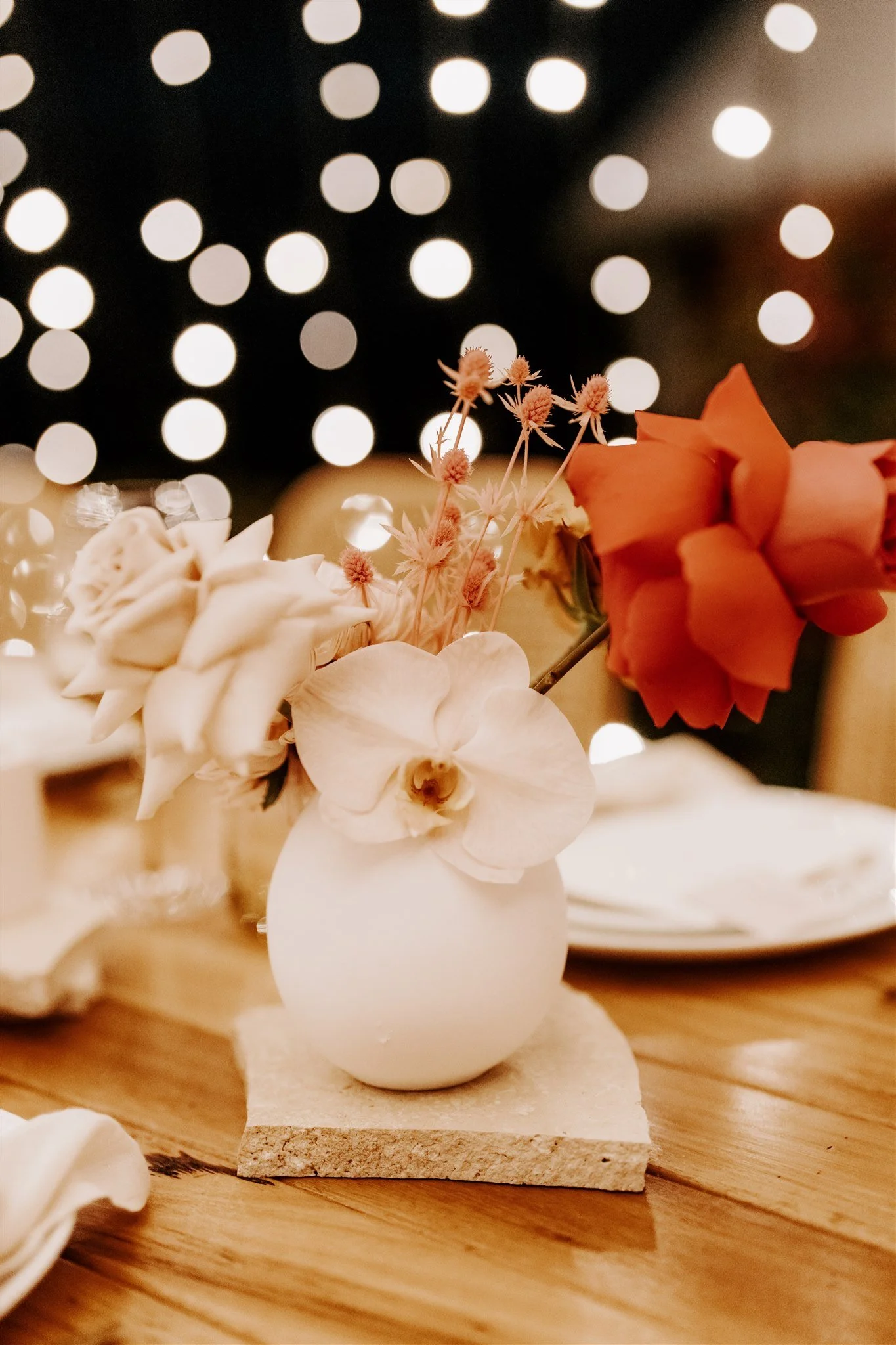 This colour palette featured a base of Crisp White & Pale Timbers… teamed with Dusty Pink, Caramels & Brushed Gold… complimented by pops of Toffee, Orange, Terracotta, Bright Pink, Mid Pink and Mustard florals…with just a touch of Nude & Almond…