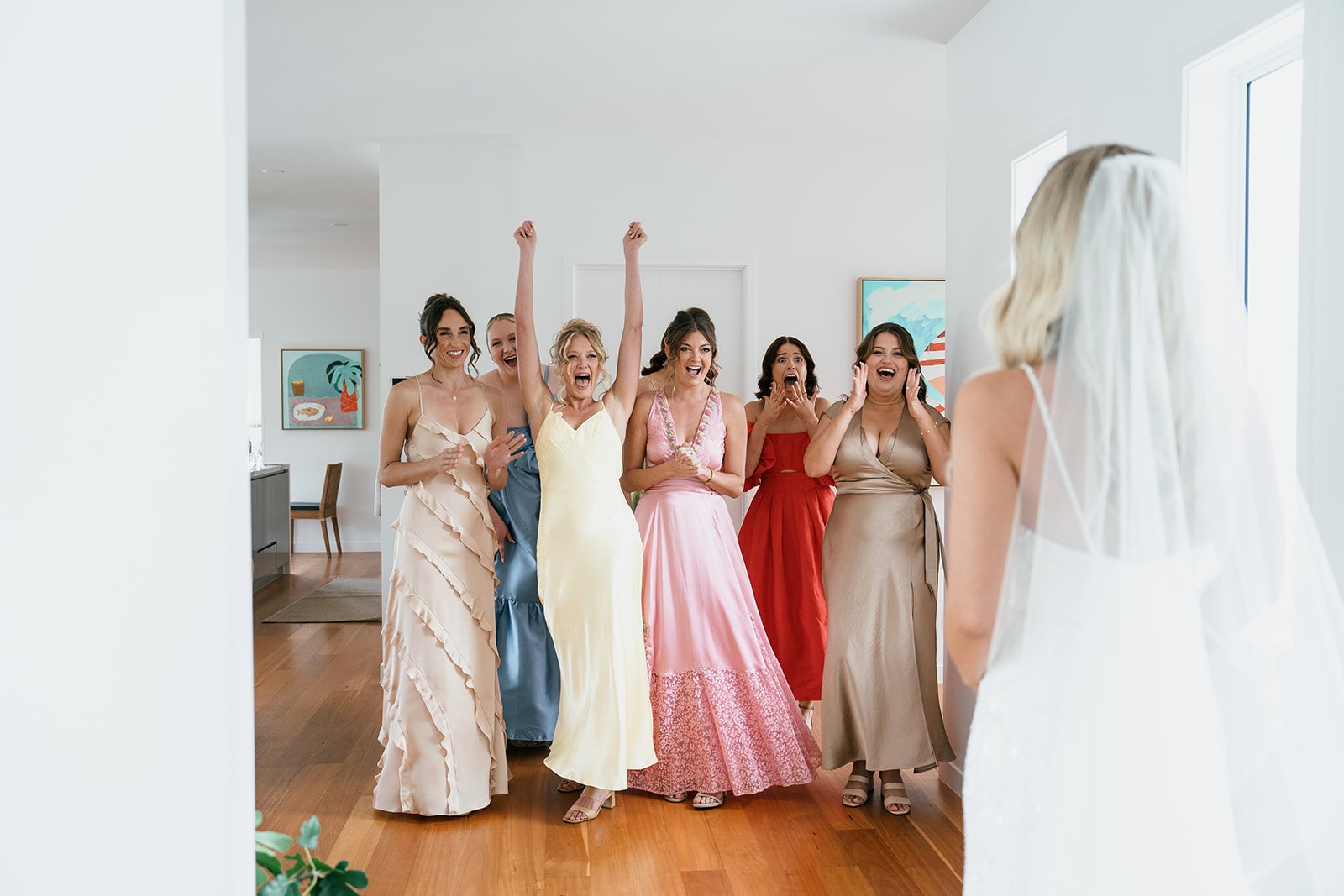 Ceremony Location: Maison La Plage; Planning, Styling & Stationery: Lovebird Weddings; Reception Venue: Sunshine Beach Surf Club; Photography: Jac Lee Weddings; Film: Bluevale Films; Hair & Makeup: Lauren Montgomery & Evalyn Parsons; Florals: Mondo Floral Designs; Cake: Chocolate 2 Chilli; Entertainment: Birdman Randy; Transport: Hintercoast Transport; Dancefloor: G&M Event Group; Celebrant: Paul O’Shea; Bridal Party Transport: Elite Executive Transfers